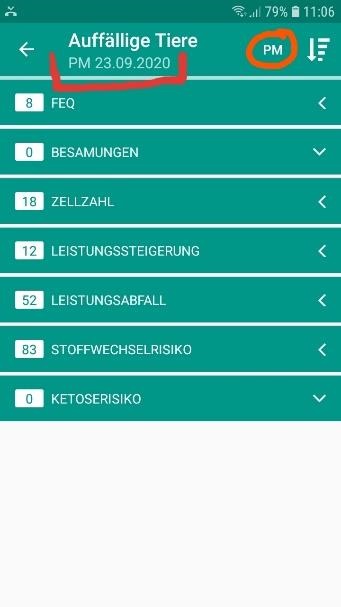 Ab sofort kann in der Aktionsliste auffällige Tiere, zwischen einem der 3 letzten Probemelkungen ausgewählt werden. Dies ermöglicht die Sicht auf die auffälligen Tiere der aktuellen, letzten und vorletzten Probemelkungen. Durch Klick auf PM erscheint ein PM-Datums-Auswahlfeld "Probemelkung wählen". Das ausgewählte PM-Datum
