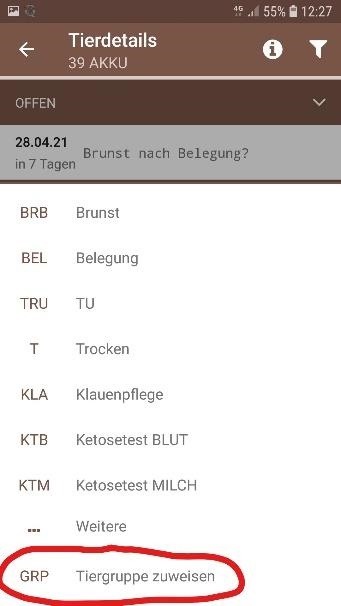 Ab sofort können auch in der RDV mobil App Tiere einer (zuvor im LKV-Herdenmanager erstellten) Tiergruppe zugeordnet werden - siehe Tierauswahl > Auswahl Tier > Details > "+" > Aktion/Beobachtung > "Tiergruppe zuweisen". Hier kann das ausgewählte Tier einer (neuen) Tiergruppe zugeordnet werden, die bestehende Tiergruppe geändert oder gelöscht werden. Welcher Tiergruppe ein Tier momentan zugeordnet ist, ist in der Ansicht Tierinfo oberhalb der Abstammung zu sehen.
