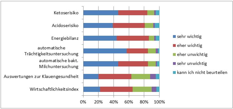 Ein großes Schlagwort der aktuellen Zeit ist die Datenvernetzung. So gaben 93 % der Betriebe mit Melkroboter an, dass die Vernetzung der Daten des Melkroboters und der LKV Daten von hoher Bedeutung sind. Da vor allem Melkroboterbetriebe auch Tiersensoren verwenden, ist diesen die Einbindung von Sensordaten sehr wichtig. Die Abbildung und Verknüpfung von Ergebnissen der bakteriologischen Milchuntersuchungen, Tankmilchuntersuchung, Futteruntersuchung sowie Klauenpflege mit den LKV Daten ist ein weiteres großes Anliegen.